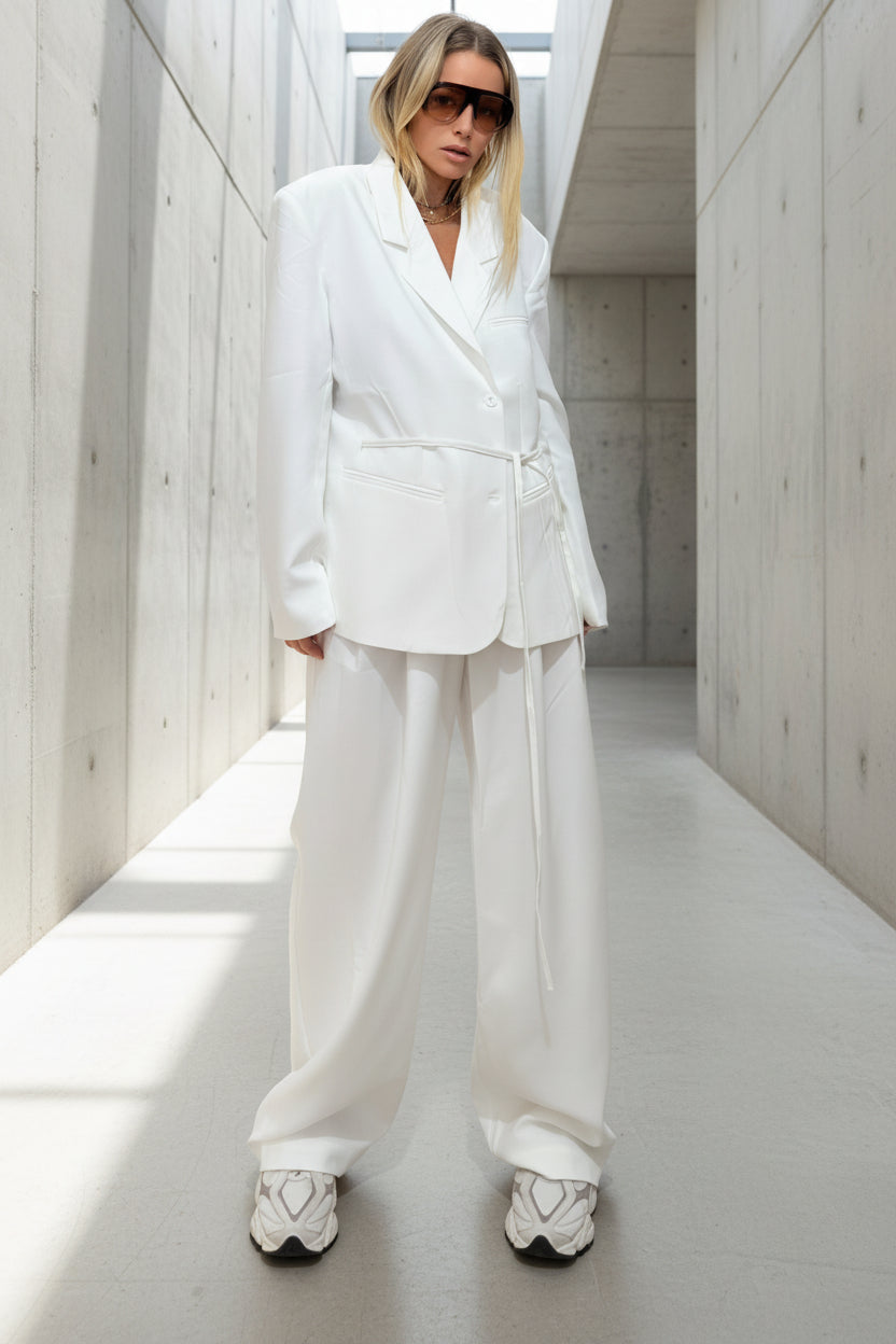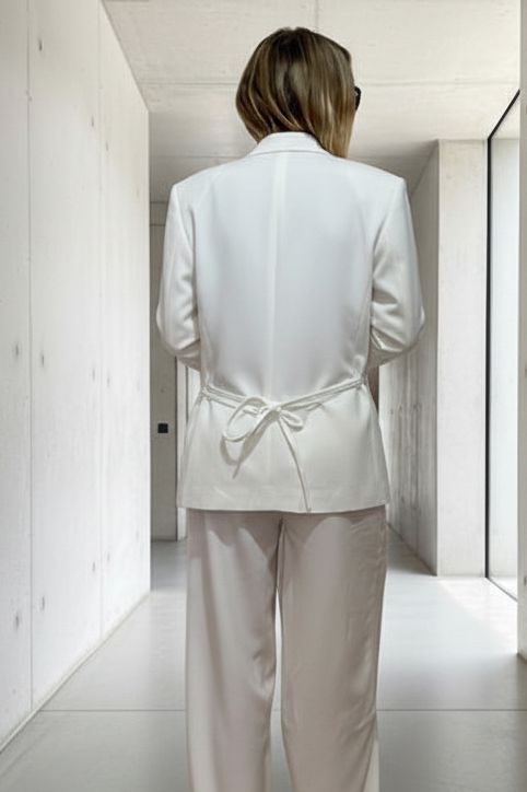 הבלייזר מגיע עם חגורה דקה שניתן לקשור מאחור או מקדימה ליצירת מראה יותר מחויט, או ללבוש פתוח ללוק משוחרר ואלגנטי.