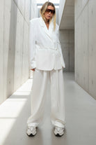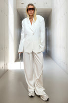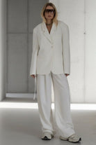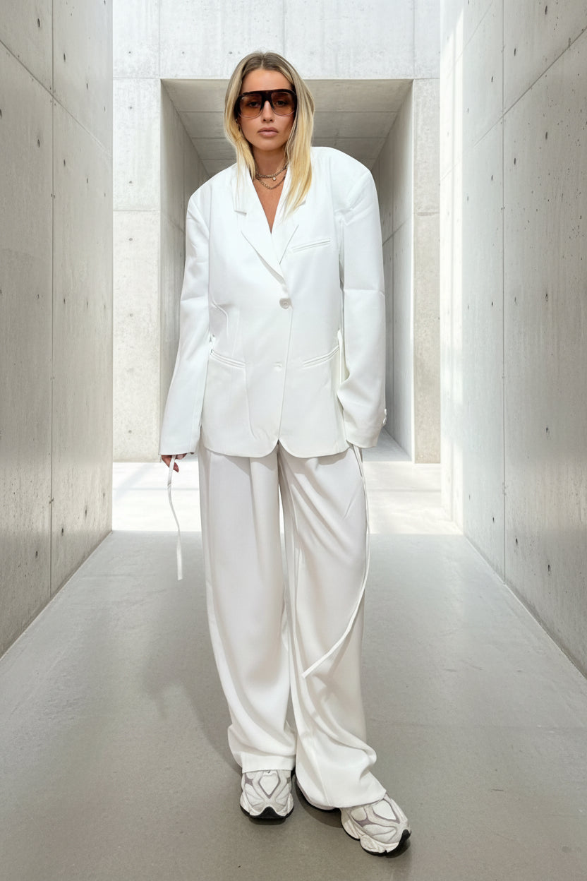 הגזרה הרחבה והכתפיים המודגשות יוצרות סילואט אופנתית ומלאת נוכחות, בסגנון טום־בוי שיק שמושפע מעולם החליפות הקלאסי.