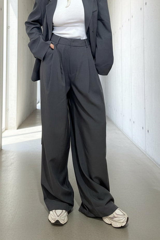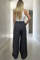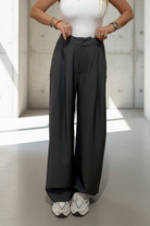 מכנס דדי רחב בגזרה גבוהה עם קפלים קדמיים (פנסים) שמעניקים מראה מחויט אך נינוח.