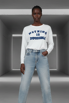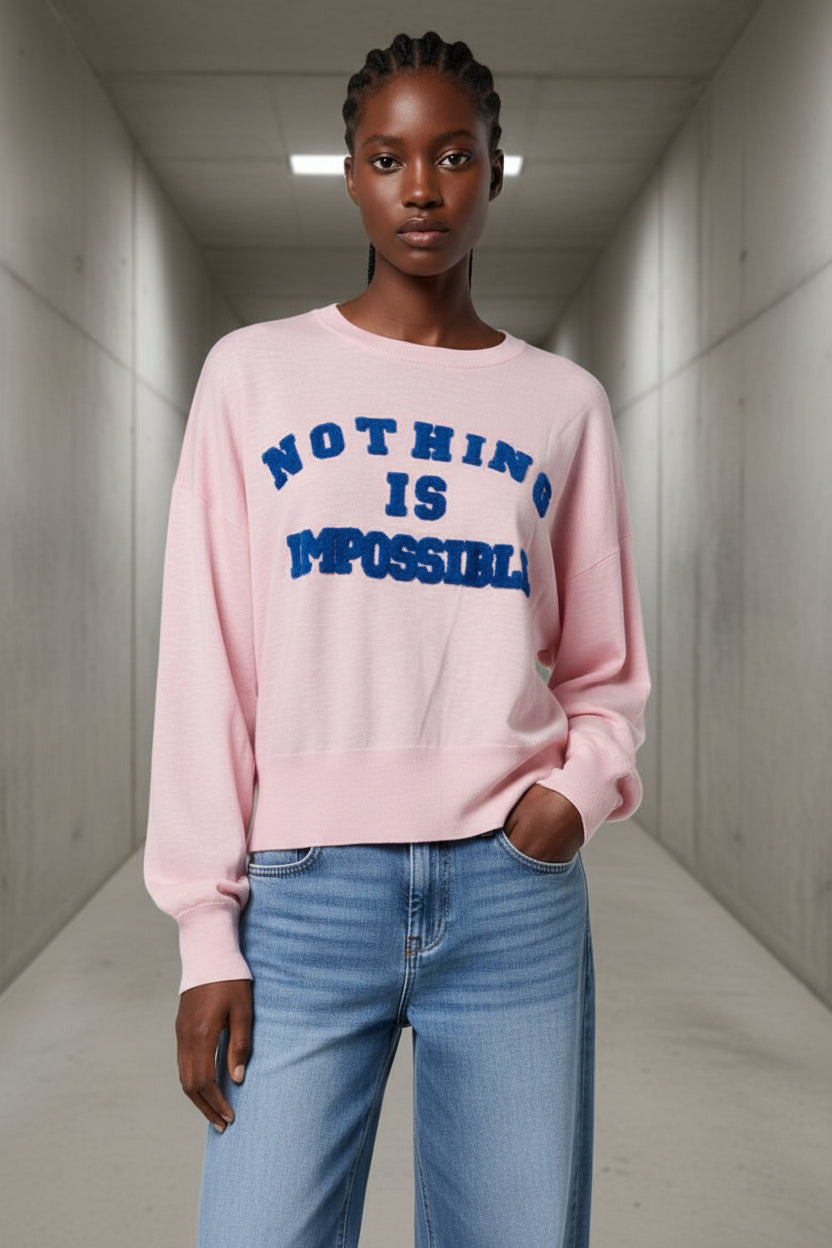 סריג דקיק, רך וקליל עם הדפס בולט “Nothing Is Impossible” בטקסטורת בוקלה שמוסיפה עומק ונוכחות.