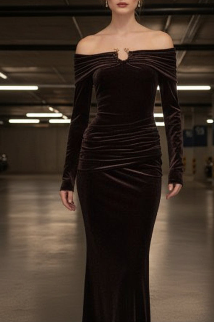 שמלת ערב מקסי אוף־שולדר מבד קטיפה גוון חום כהה